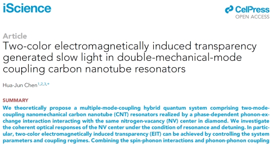 近期,我中心教师陈华俊以唯一作者身份在Cell子刊iScience发表题为《Two-color electromagnetically induced transparency generated slow light in doublemechanical- mode coupling carbon nanotube resonators》的论文,36365线路检测中心入口为唯一完成单位。