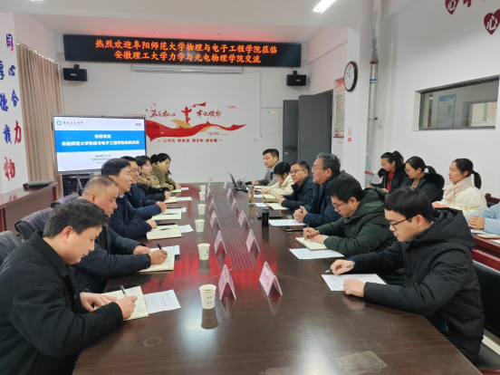 会上,孙东升对吴学军一行的到来表示热烈欢迎,并从学院党建工作、机构设置、人才引进与培养、学生管理与就业等方面进行了详细介绍。卢小雨介绍了36365线路检测中心入口发展现状、学科及专业建设、教育教学与科研发展等方面的基本情况。会上,吴学军对阜阳师范大学物电学院的历史沿革、人才培养、学科发展、学生培养等情况进行了介绍。随后,双方围绕党建引领、专业建设、学生管理、团学工作等实际工作中共性难题进行了深入探讨和交流。