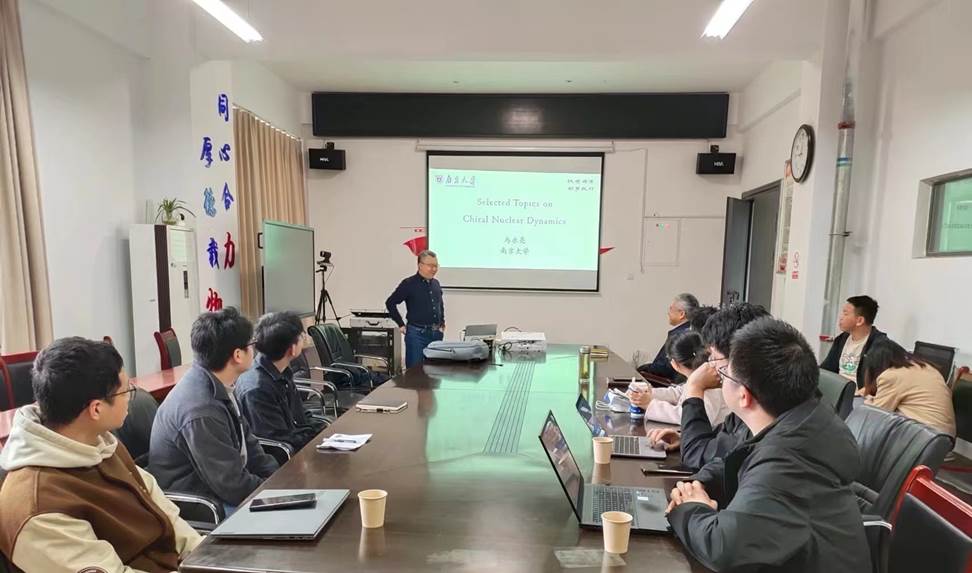 应36365线路检测中心入口(基础物理研究中心)邀请,4月8日至11日,南京大学马永亮教授来36365线路检测中心入口做学术交流,并做题为《手征核子动力学选题》的系列报告,本次学术交流是基础物理研究中心的第一期短期课程,讲授内容基于马永亮教授受邀撰写的图书《Effective Field Theories for Nuclei and Compact-Star Matter: Chiral Nuclear Dynamics》中的部分章节。报告会在院报告厅举行,由学院主要负责人主持,学院领导对马永亮教授的到来表示热烈欢迎,中心成员及学院部分青年教师和研究生参加了报告会。